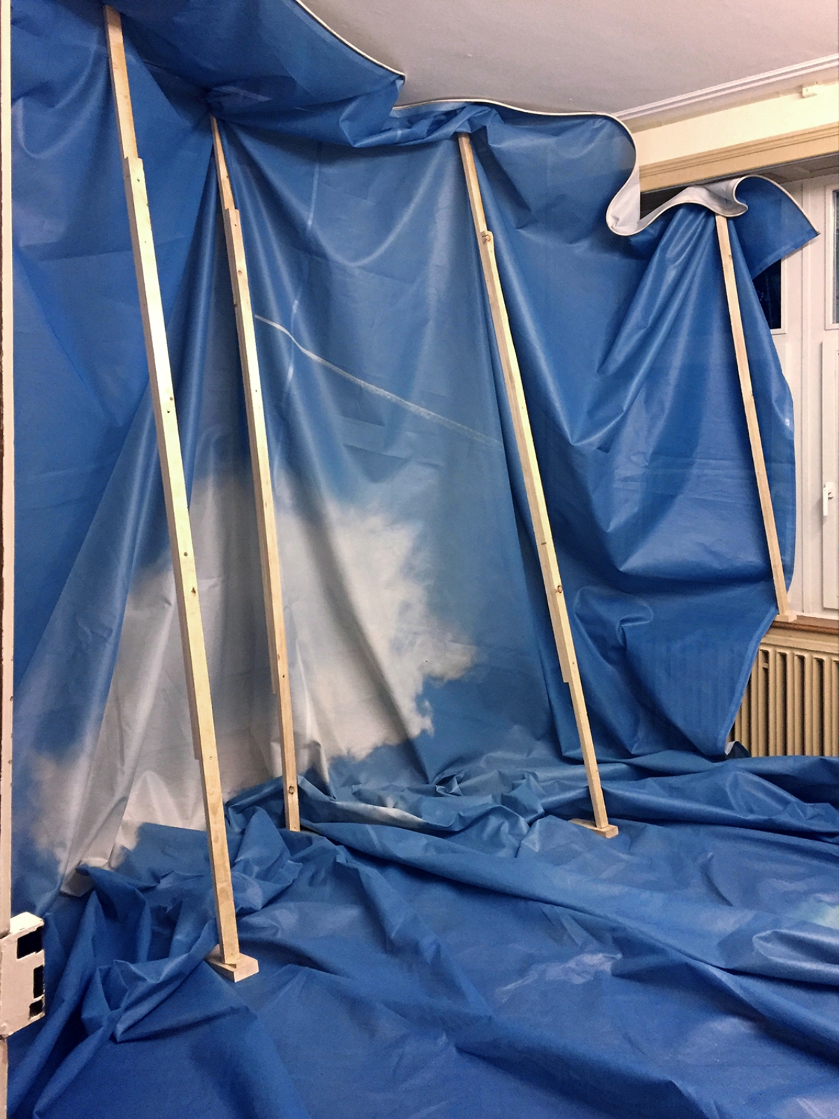 In der Villa Renata plane ich nun die tote Wolke in einen noch kleineren Raum zu drucken. Sie wird wie eine verirrte Stubenfliege am Ende dieses lauen Sommers im quadratischen Zimmer der Villa eingefangen sein. Gehalten wird die Plane durch eingeschobene Holzlatten zwischen Boden und Decke, die Betrachter werden aufgefordert, den Raum zu betreten. Sie müssen die Kunst mit den Füssen betreten, um sie vollständig betrachten zu können.